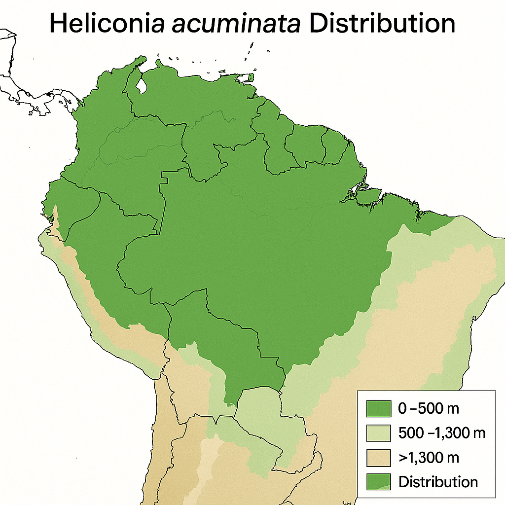 La Heliconia acuminata es una especie eminentemente sudamericana con una amplia distribución en la cuenca del Amazonas y el Escudo Guayanés. Se encuentra de forma nativa en Brasil (especialmente en la región norte), Colombia (regiones de la Amazonia y Orinoquia), Venezuela, Guyana, Surinam, Guayana Francesa, Perú y Bolivia. Su rango altitudinal es amplio para una planta tropical, localizándose desde el nivel del mar hasta los 1,300 metros de altitud, aunque es más frecuente en tierras bajas y zonas de piedemonte.