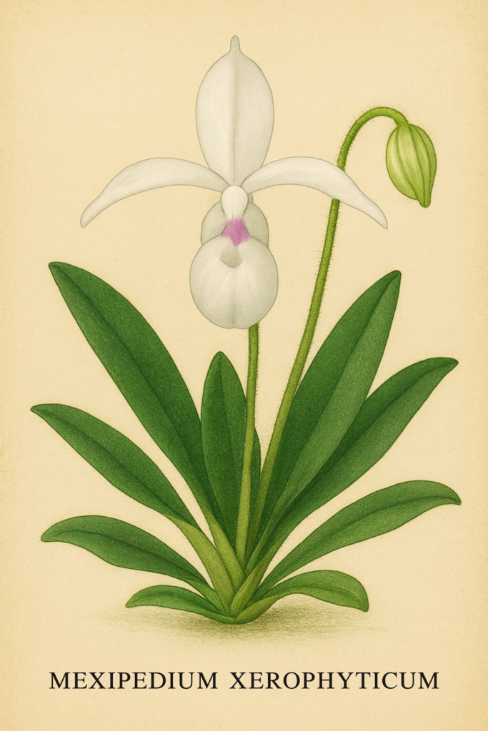 Nombres científicos relacionados: La historia taxonómica del Mexipedium xerophyticum es breve pero significativa, reflejando el debate botánico que surgió al intentar clasificar una planta que rompía con todos los esquemas conocidos para las orquídeas de su tipo en América.