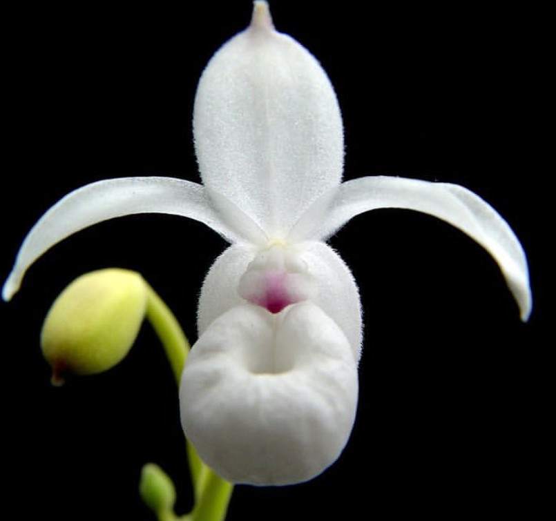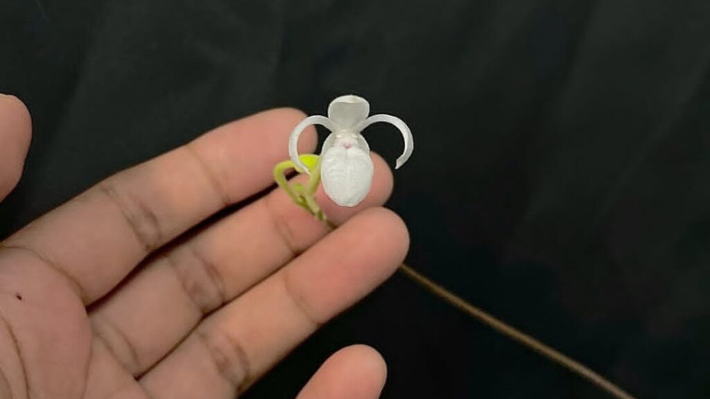 Flores Verdaderas: Son zigomorfas y minúsculas en comparación con sus parientes, midiendo entre 1 y 2 cm de diámetro. Los sépalos laterales están fusionados en un sinsepalo que se sitúa detrás del labelo. Los pétalos son extendidos, de un blanco translúcido con tintes rosados. El labelo es la pieza más llamativa: tiene una forma de bolsa globosa o “zapato” de color blanco perlado, cuya función es atrapar temporalmente a los insectos para asegurar que, al salir, recojan o depositen el polen.