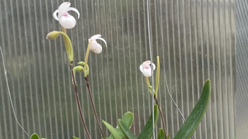Apertura Escalonada: Las flores abren una a una o en pequeños grupos. Los pétalos blanco-perlados se despliegan revelando el labelo en forma de bolsa, cuya textura parece de porcelana fina con sutiles venaciones rosadas.