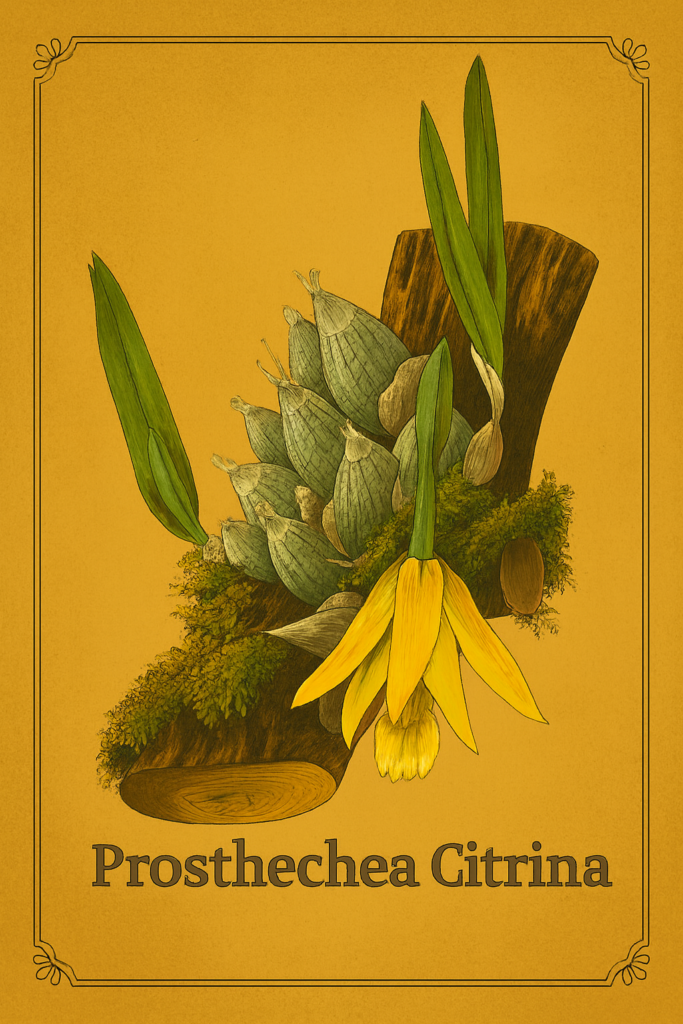 La Prosthechea citrina es una especie de orquídea epífita y perenne, perteneciente a la familia Orchidaceae. Es endémica de México, distribuyéndose principalmente en las regiones montañosas del Eje Neovolcánico y la Sierra Madre del Sur. Se distingue notablemente por su hábito de crecimiento péndulo (hacia abajo), lo que la obliga a vivir en las ramas inferiores o troncos de encinos (Quercus), donde sus raíces se anclan firmemente a la corteza para colgar sus pseudobulbos. Sus flores son grandes, de un amarillo intenso y poseen un aroma cítrico muy penetrante, lo que le ha valido el nombre popular de “orquídea limoncito” o limocillo.