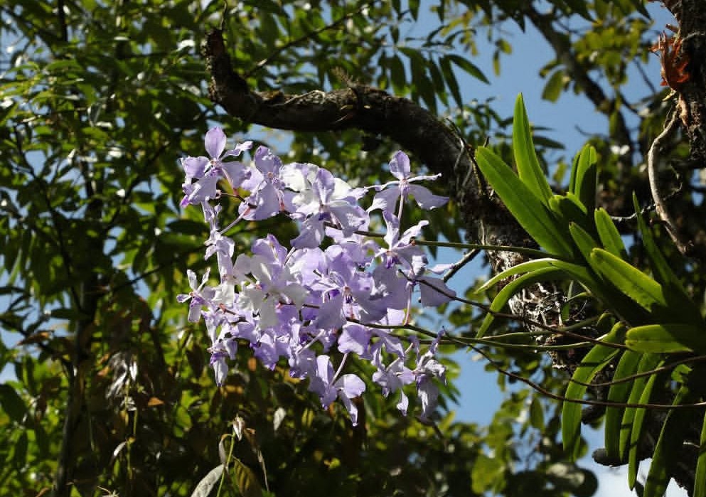 Una peculiaridad biológica de esta especie es su floración axilar y majestuosa, un despliegue de color que rompe la hegemonía verde del dosel forestal. De las axilas de las hojas brotan largas inflorescencias racemosas que sostienen de 5 a 15 flores de pétalos firmes y texturizados en un inusual azul lavanda o celeste, ornamentadas con un patrón de venas más oscuras que crean un efecto de encaje o red. Tras la polinización por abejas especializadas del género Xylocopa, las flores dan paso a cápsulas oblongas que contienen miles de semillas microscópicas diseñadas para ser dispersadas por el viento. A diferencia de otras orquídeas de colores cálidos y saturados, la Vanda coerulea posee una elegancia etérea que le permite fundirse con la bruma de las montañas, transformando una rama desnuda en un despliegue arquitectónico de geometría flora