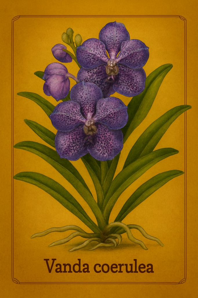 Lindley y la formalización botánica: Fue el célebre botánico inglés John Lindley, considerado el “padre de la orquideología moderna”, quien validó y publicó formalmente la especie en 1847 en la obra The Botanical Register. Basándose en los manuscritos y especímenes de Griffith, Lindley reconoció la singularidad del taxón y conservó el epíteto específico coerulea (del latín caeruleus, que significa “azul oscuro” o “celeste”), integrándola definitivamente en el género Vanda, el cual había sido establecido previamente por Sir William Jones.
